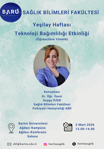 Bartın Üniversitesi Sağlık Bilimleri Fakültesi Psikiyatri Hemşireliği Anabilim Dalı katkılarıyla 1-7 Mart Yeşilay Haftası kapsamında teknoloji bağımlılığına yönelik farkındalık etkinliği düzenlendi. Fakülte öğrencilerinin yoğun katılım gösterdiği programda, dijital çağın birey üzerindeki etkileri çok boyutlu olarak ele alındı.